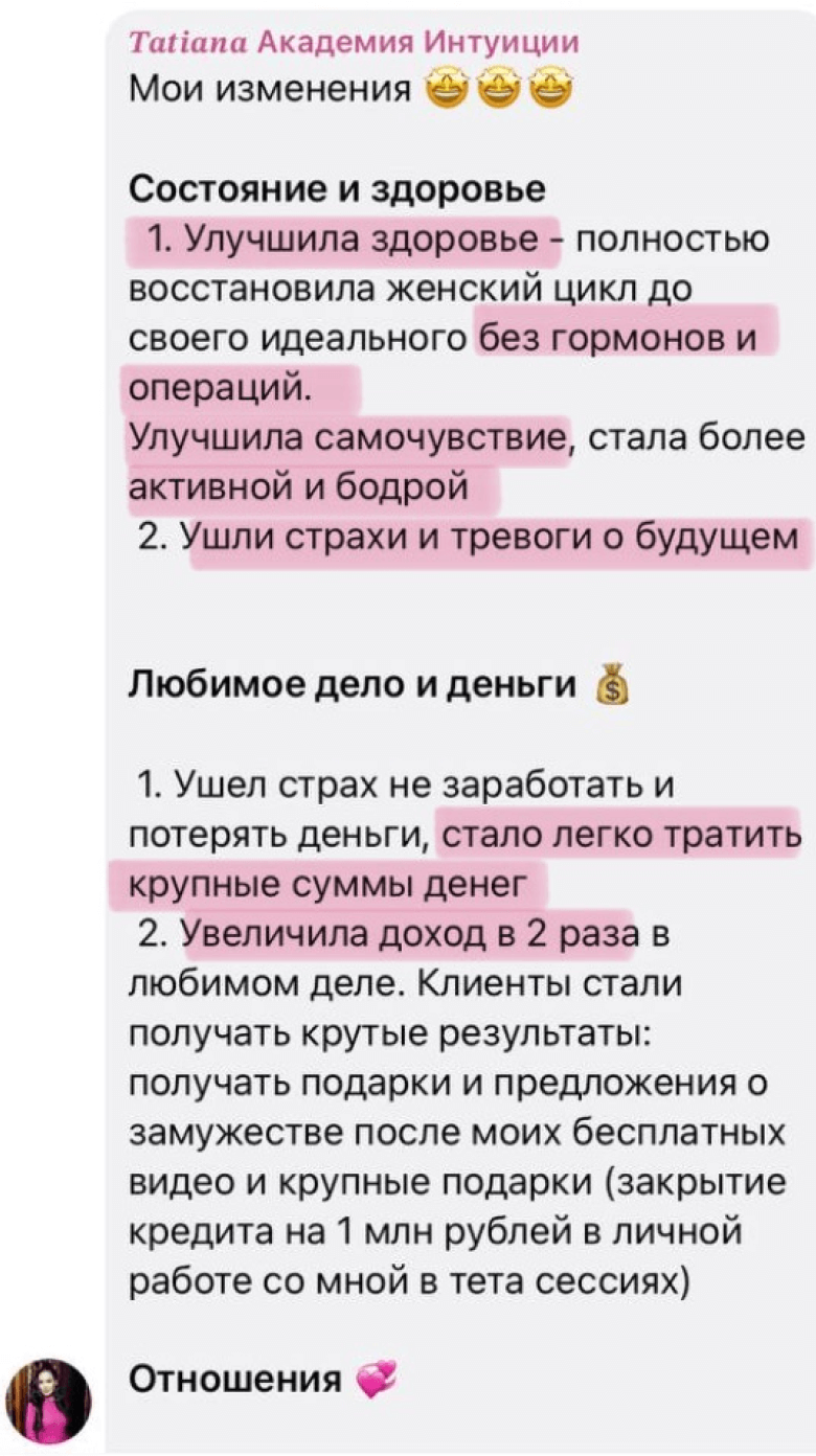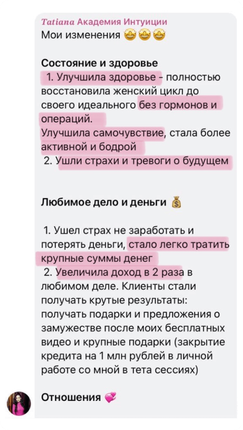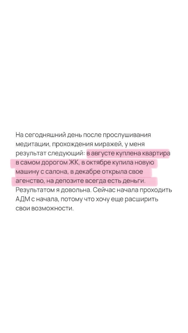 Обучает создавать с нуля любые обстоятельства жизни: встречать вторых половинок, выходит замуж, менять отношение людей, их решения с помощью понимания истинного мироустройства и i-медитаций