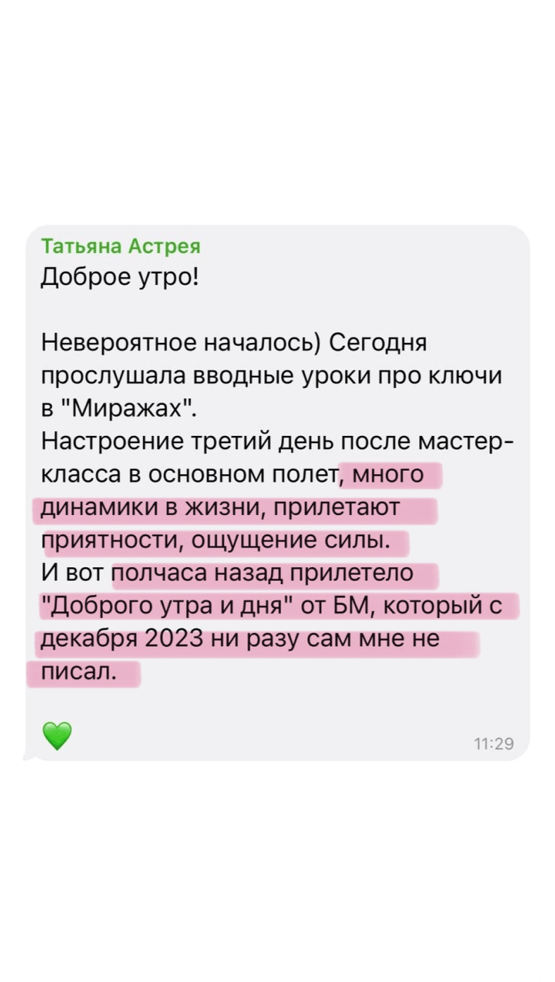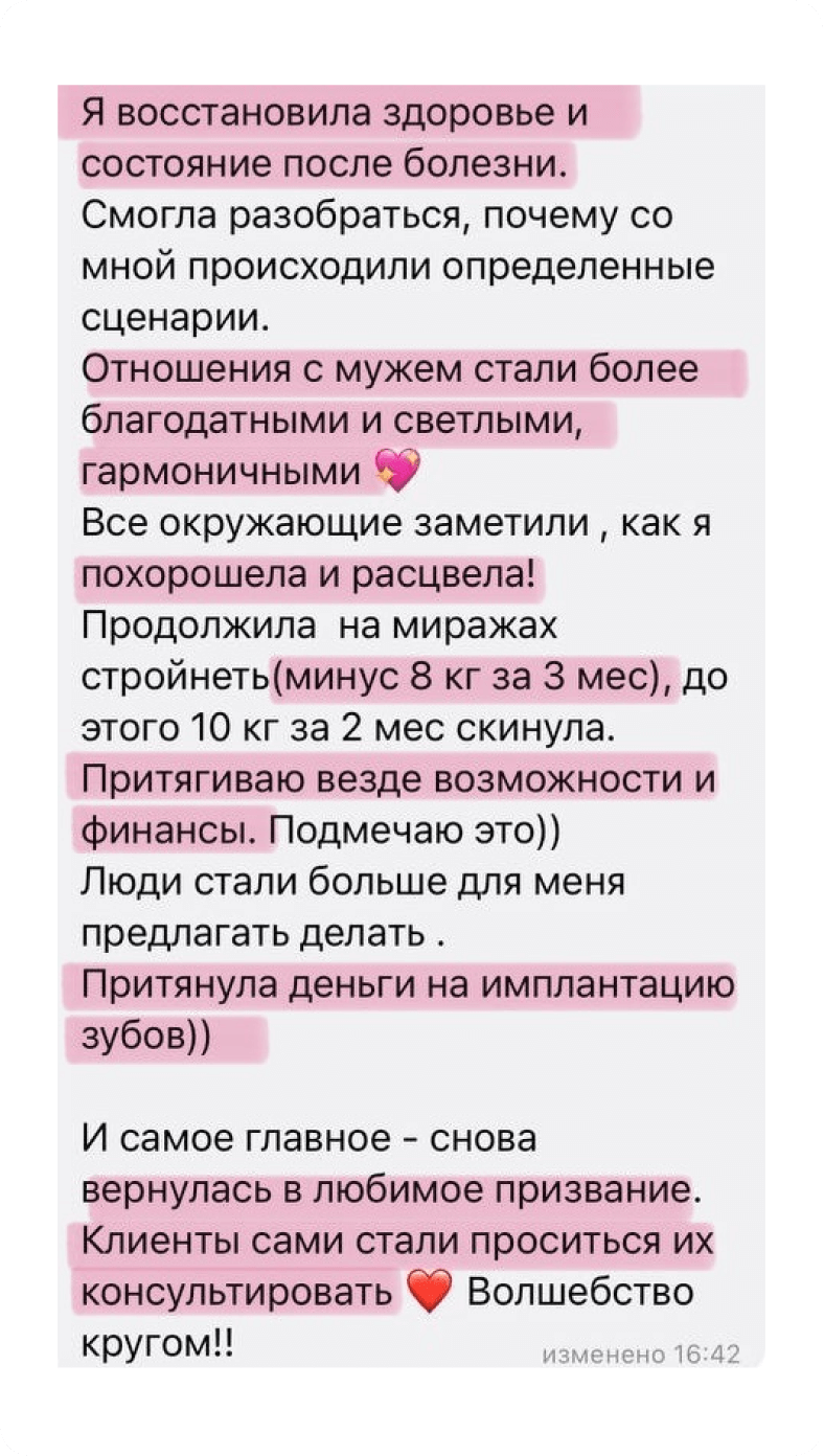 Обучает создавать с нуля любые обстоятельства жизни: встречать вторых половинок, выходит замуж, менять отношение людей, их решения с помощью понимания истинного мироустройства
